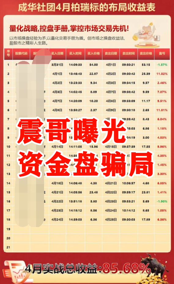 兄弟们注意了!震哥今天必须给你们扒一扒这个叫“成华社团”的股票跟单骗局,操盘手葛成华已经圈走一个多亿,现在正疯狂收割,离跑路就差一步!