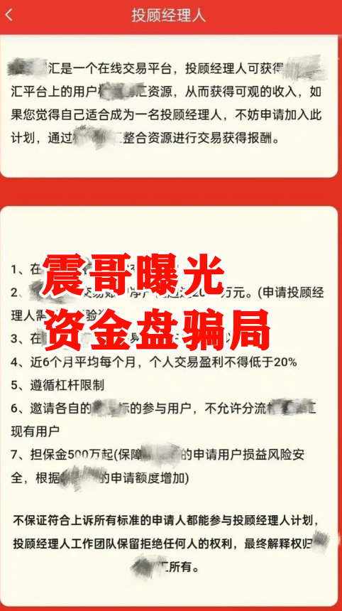 更恶心的是,他们还在到处招什么“投顾师”,要求验资2000万、月盈利20%以上,摆明了就是筛肥羊。现在已经有2万多人被坑,震哥劝你们能撤赶紧撤,别等血本无归才后悔!