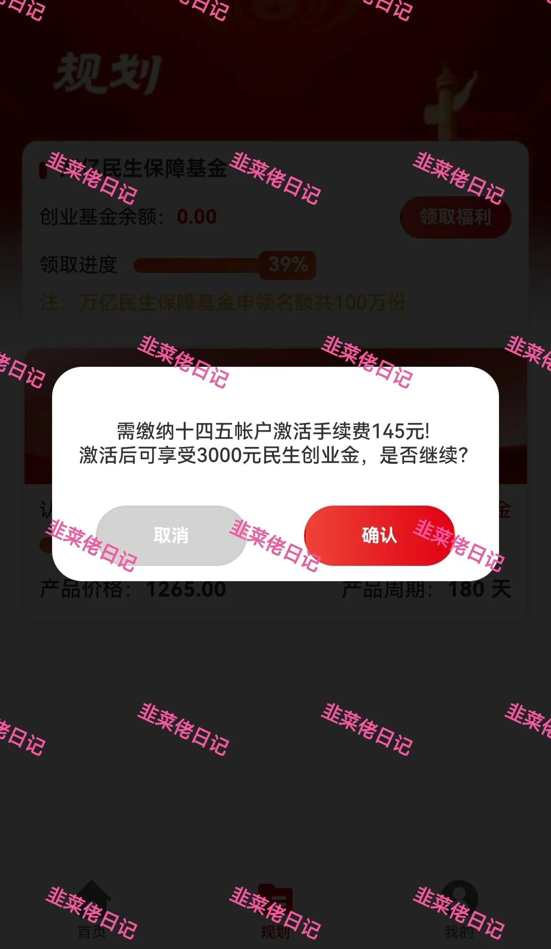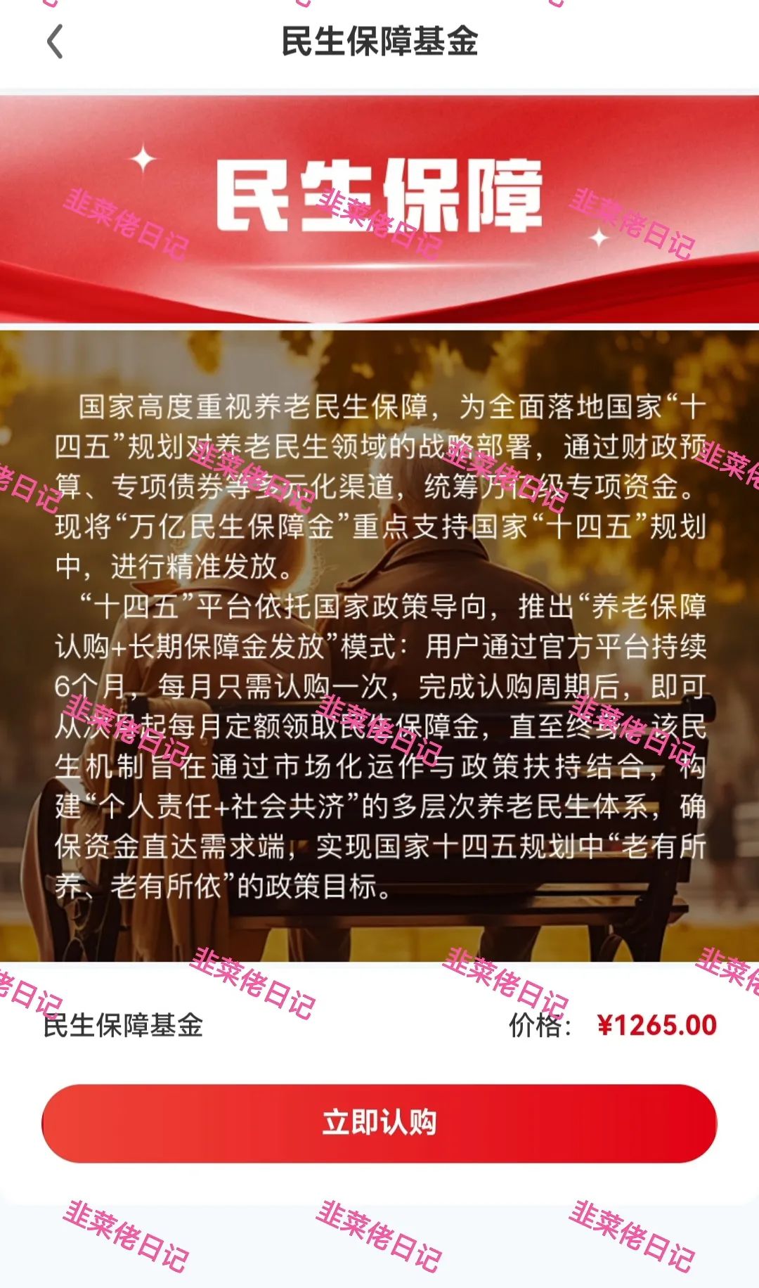 “十四五”规划:同前天发表的辉煌中国一样,也是冒充国家政策进行的资金盘,于18号上线。可以缴纳145元手续费激活账户,激活后享受3000元的民生创业金,所谓的民生创业金就类似代金券,可以在平台购买产品的时候进行抵扣。目前就一个民生保障金产品,产品价格1265元,连续购买6个月,完成认购周期后,第7个月起就可以领取一份定额的民生保障金,直至终身。这盘子也是神盘,不给收益就要人先交六个月的1265元,也就骗骗老头老太太。
